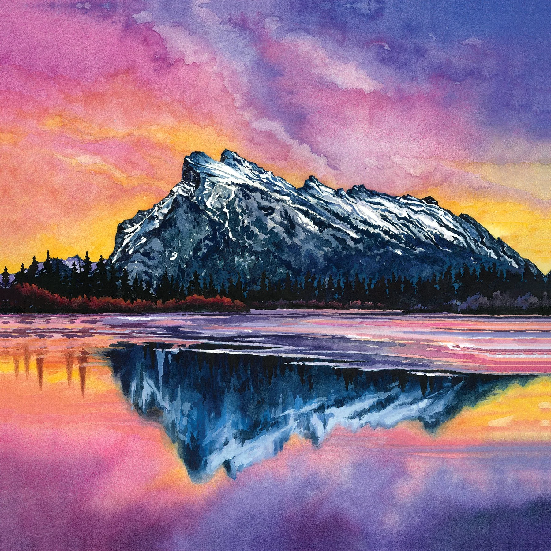 This 11x14” original watercolour painting comes float mounted on an archival quality, acid-free white mat and framed in a 17x20” natural wood frame.